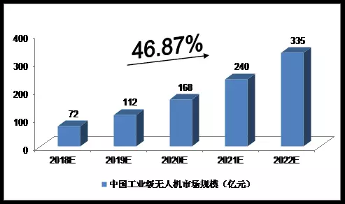 市場規(guī)模預測 綜合以上因素,我們預計,2018年中國工業(yè)級無人機市場規(guī)模將達到72億元,未來五年(2018-2022)年均復合增長率約為46.87%,2022年中國工業(yè)級無人機市場規(guī)模將達到335億元。