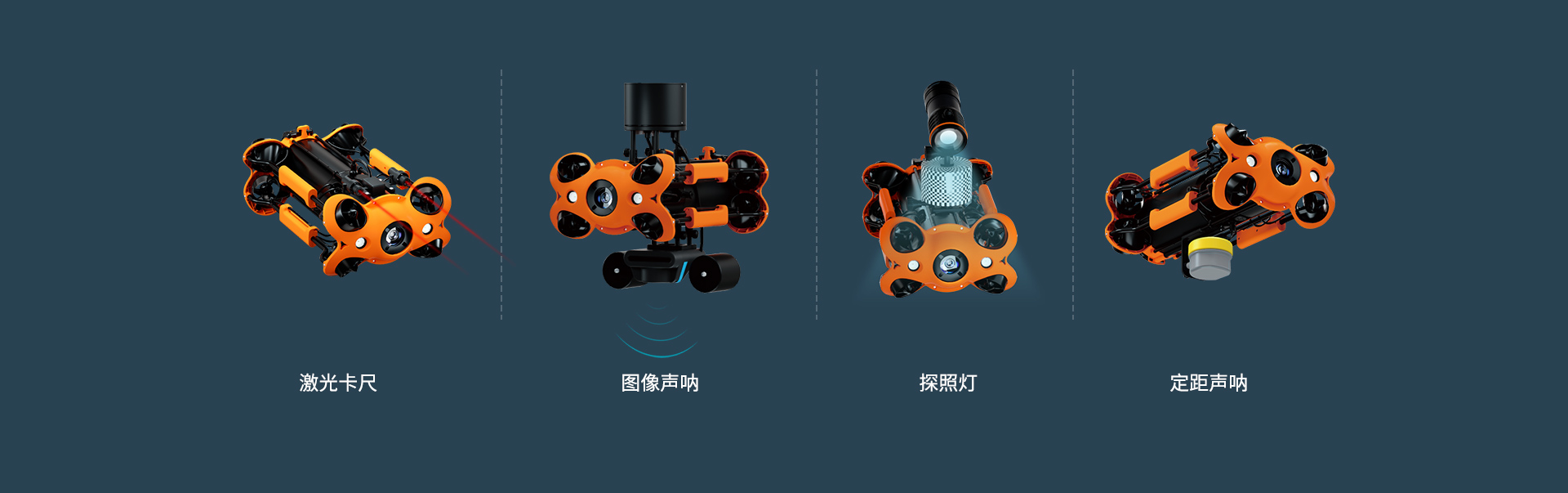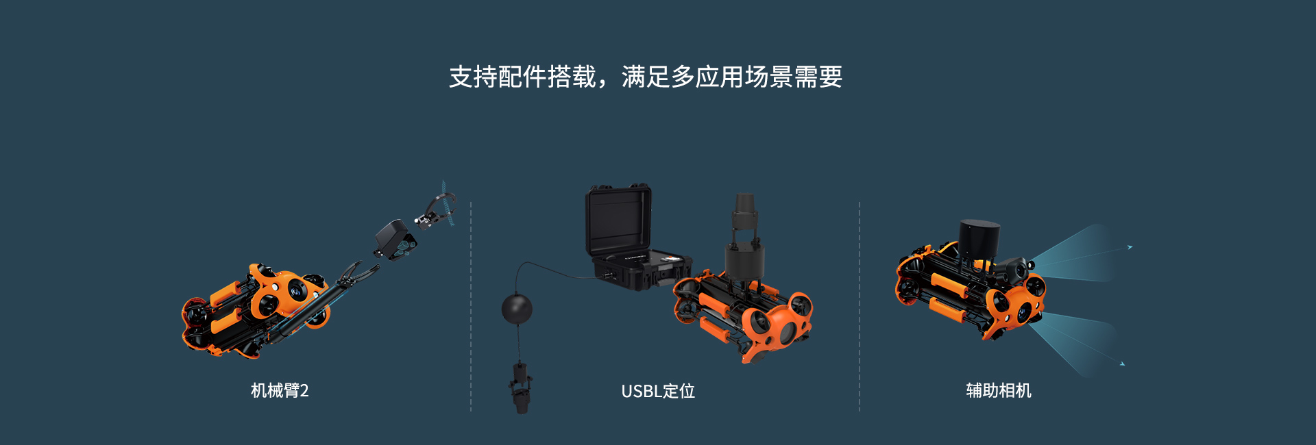 支持配件搭載,滿足多應用場景需要:機械臂、USBL定位、輔助相機、圖像聲吶、激光卡尺、探照燈、定距聲吶;
