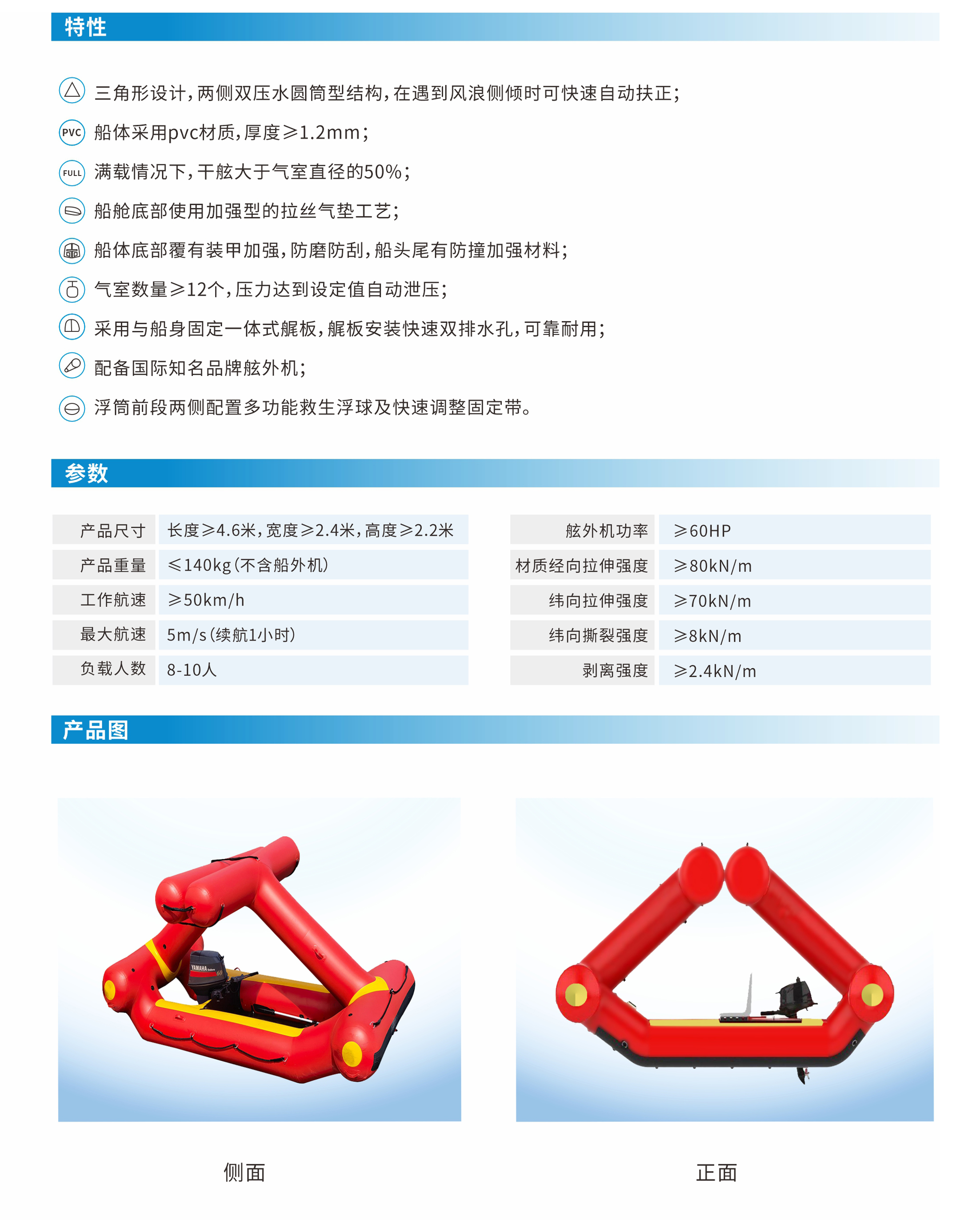 三角形設計,兩側雙壓水圓筒型結構,在遇到風浪側傾時可快速自動扶正